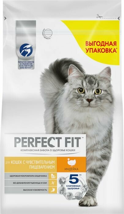 Корм сухой для взрослых кошек PERFECT FIT с индейкой, с чувствительным пищеварением, полнорационный, 2,5кг