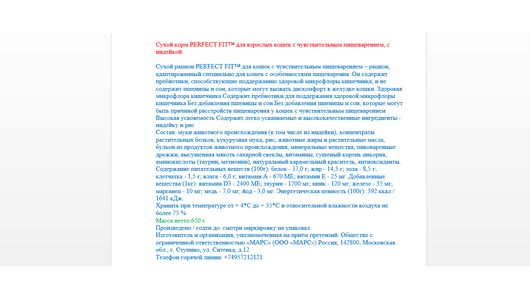 Купить PERFECT FIT SENSITIVE для взрослых кошек при аллергии с индейкой (0,65 кг)