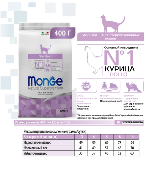 Сухой корм для стерилизованных кошек Monge Natural Superpremium, с курицей 400 г