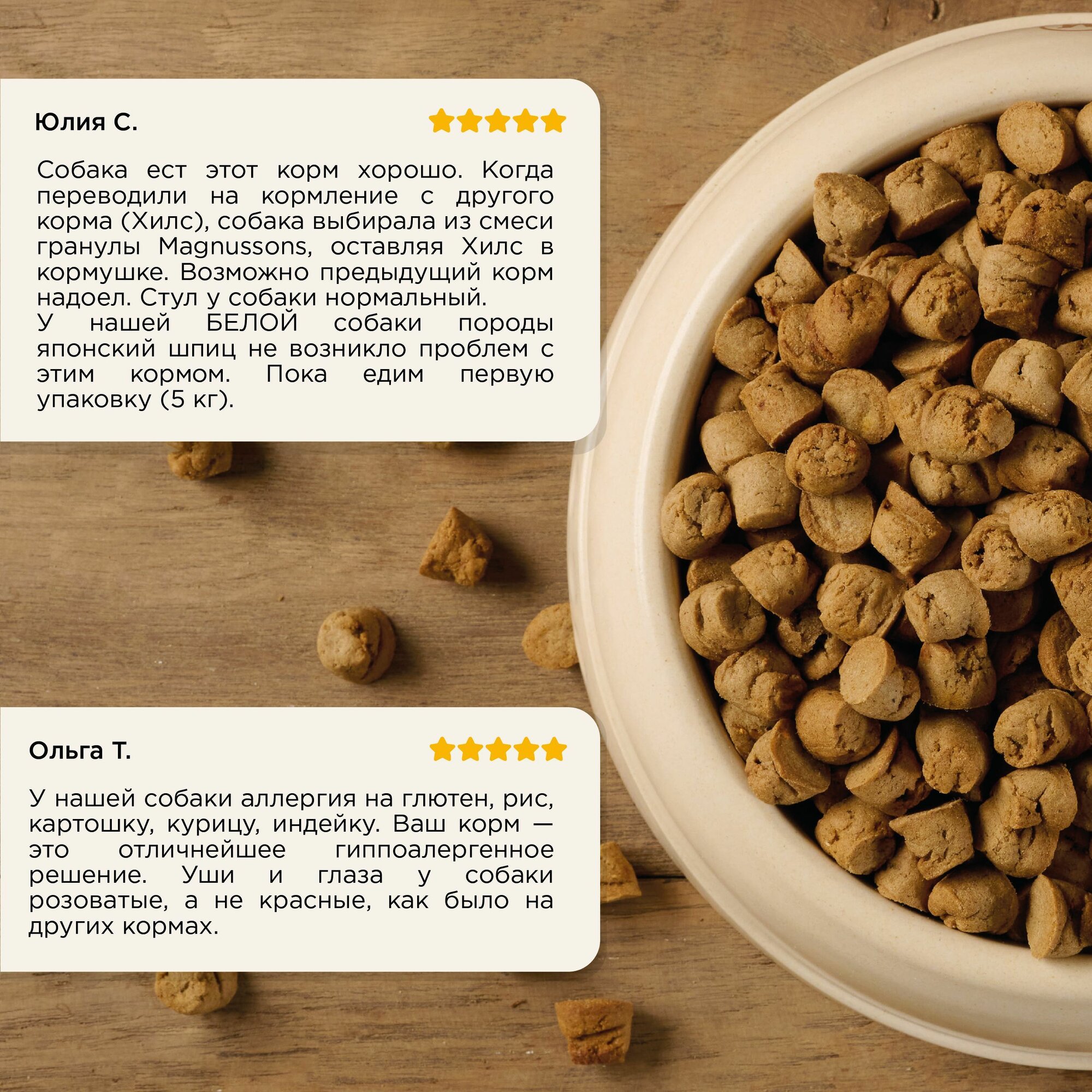 | Плюсы: | Хороший корм, собака ест нормально, никаких проблем с пищеварением и текущих глаз на нем не выявлено. |