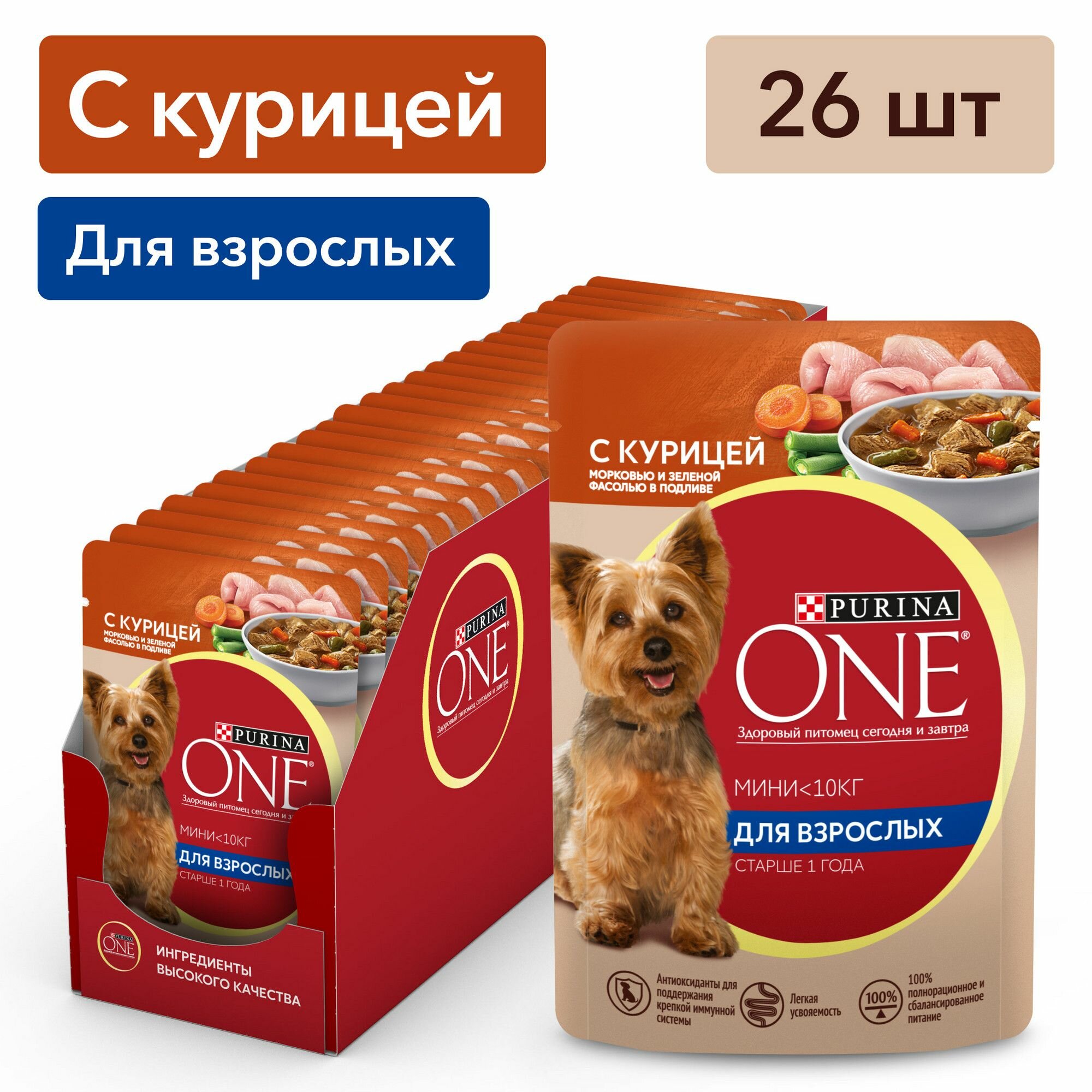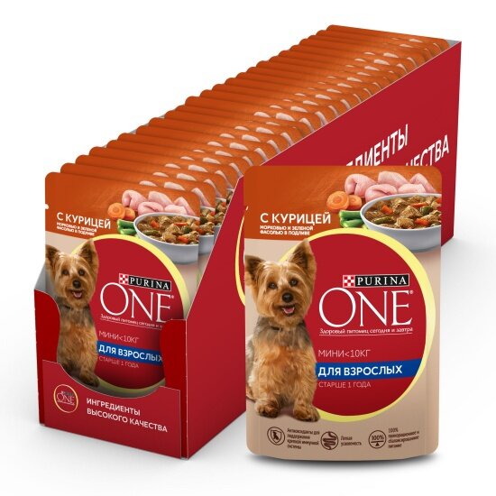 Купить Влажный корм для взрослых собак Purina One Adult мелких и карликовых пород с курицей, морковью и зеленой фасолью в подливе 26шт.*85г