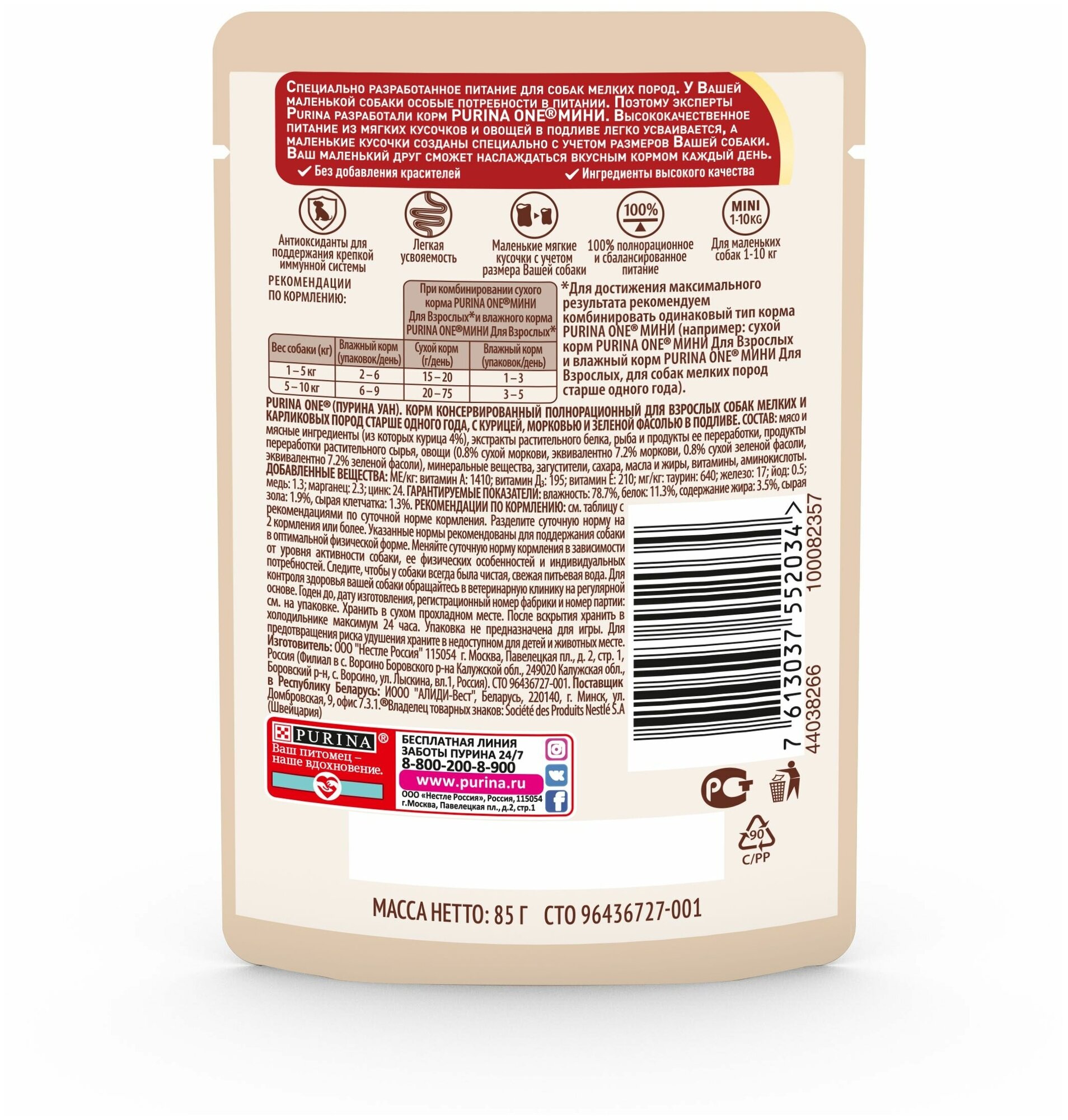 Purina One Мини пауч для активных взрослых собак мелких и карликовых пород (кусочки в подливе) Говядина, 85 г. упаковка 26 шт