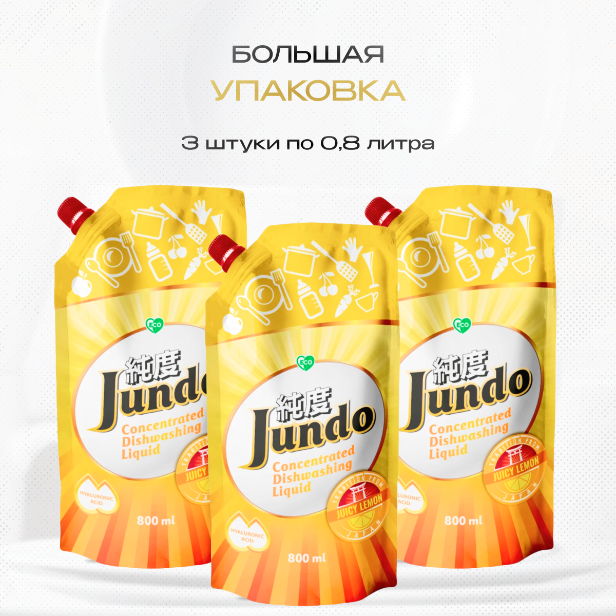 Jundo Концентрированный ЭКО-гель с гиалуроновой кислотой для мытья посуды и детских принадлежностей «Juicy Lemon», 800 мл - Упаковка 8 Шт.