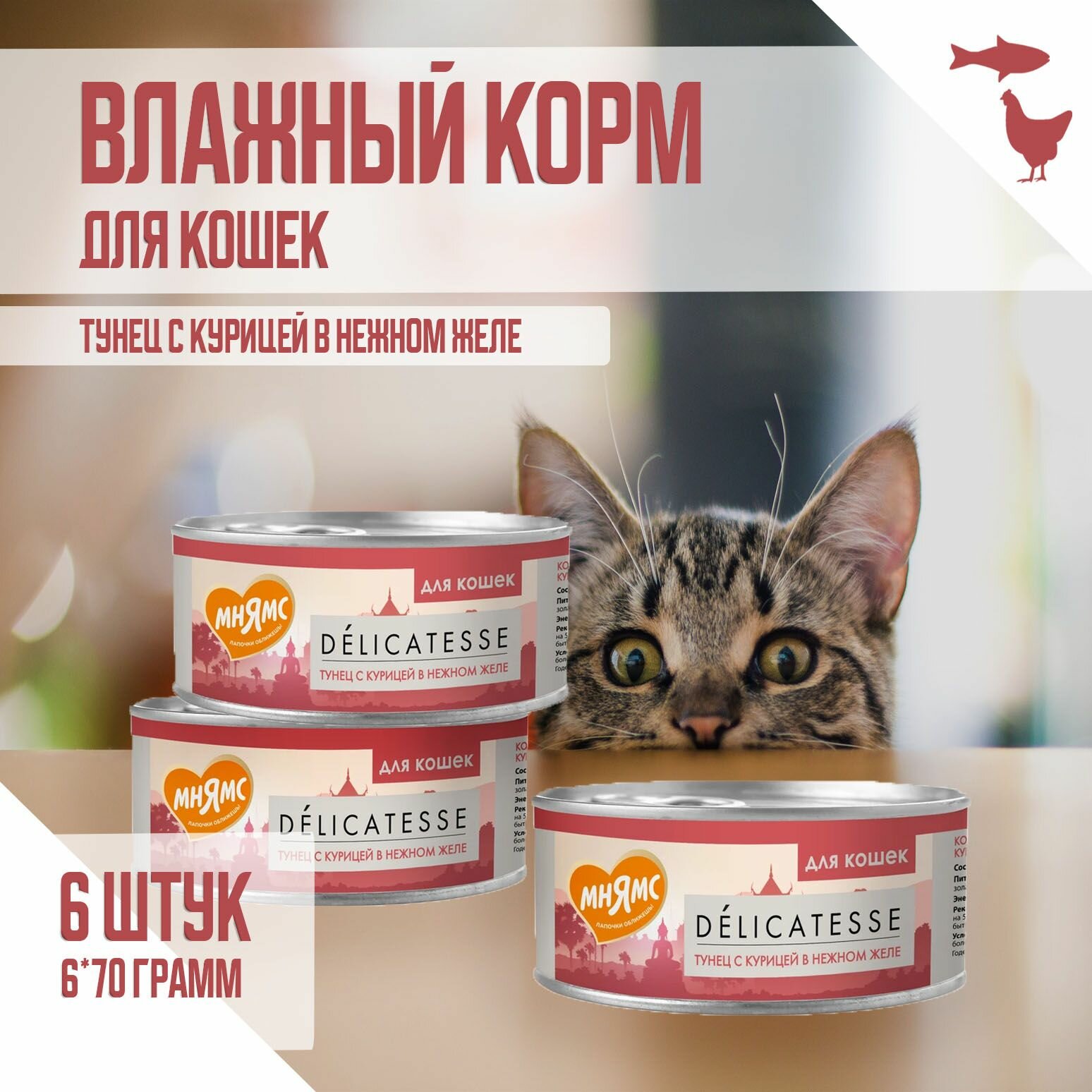 Влажный дополнительный корм Мнямс для кошек, Тунец с курицей в нежном желе 70г х 6шт интересное: