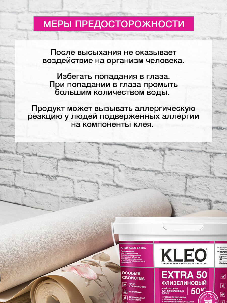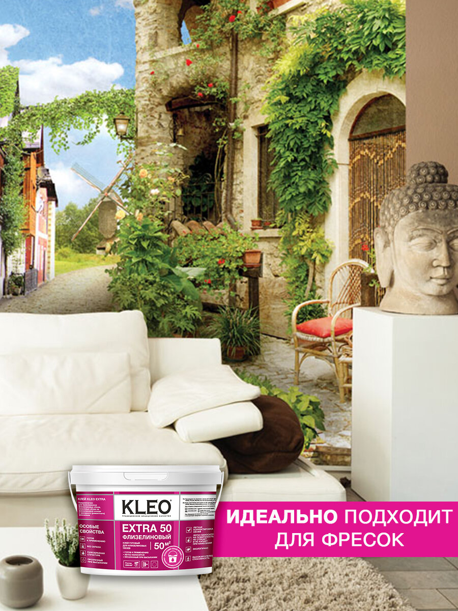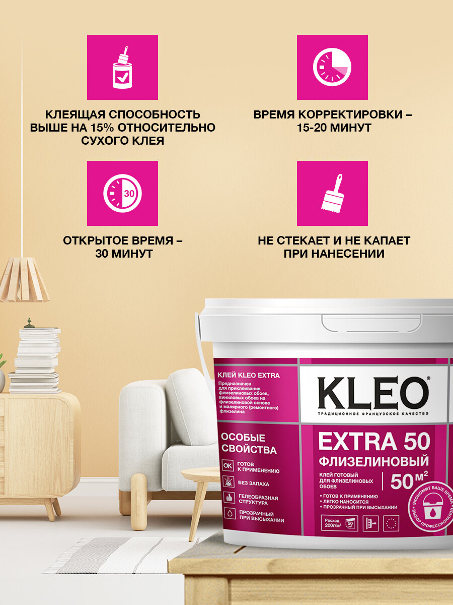 Клей готовый для флизелиновых обоев KLEO EXTRA на 50 кв.м для приклеивания всех видов флизелиновых обоев, виниловых обоев и фресок на флизелиновой основе, малярного (ремонтного) флизелина