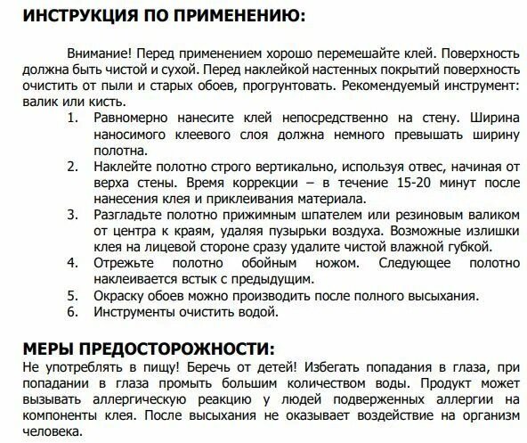 | Плюсы: | Подробная инструкция по разведению. Отлично разводится. Обой на стене легко корректируются. |