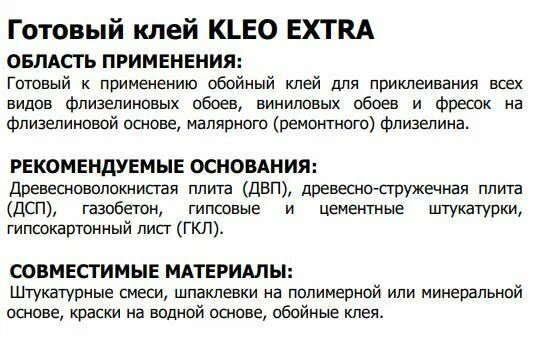 Клей готовый для флизелиновых обоев KLEO EXTRA на 25 кв.м для приклеивания всех видов флизелиновых обоев, виниловых обоев и фресок на флизелиновой основе, малярного (ремонтного) флизелина.