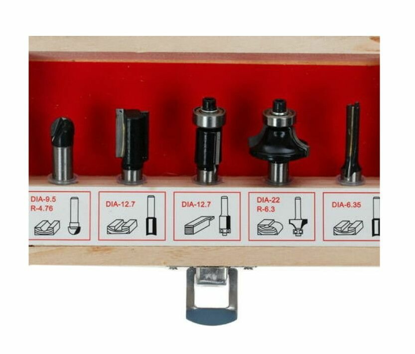 | Комплектация | галтельная фреза, пазовая фреза (2 шт), фреза для выборки заподлицо, фреза профильная с направляющей |