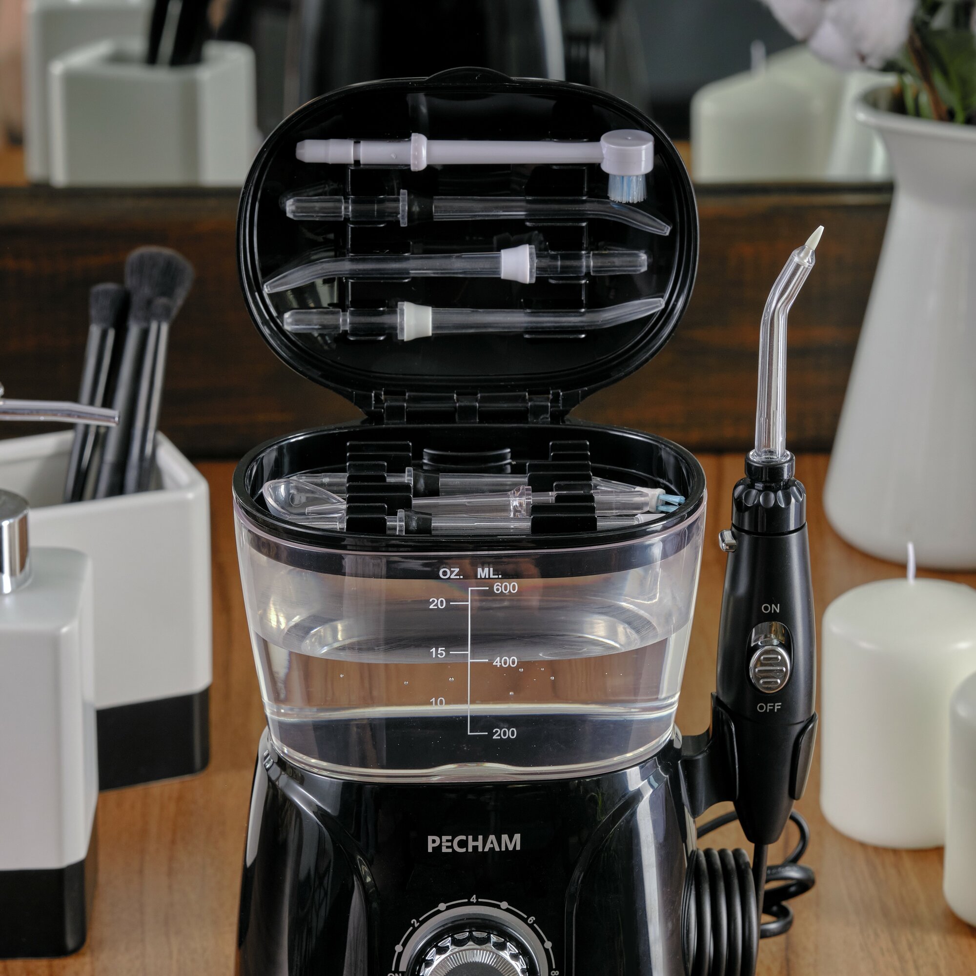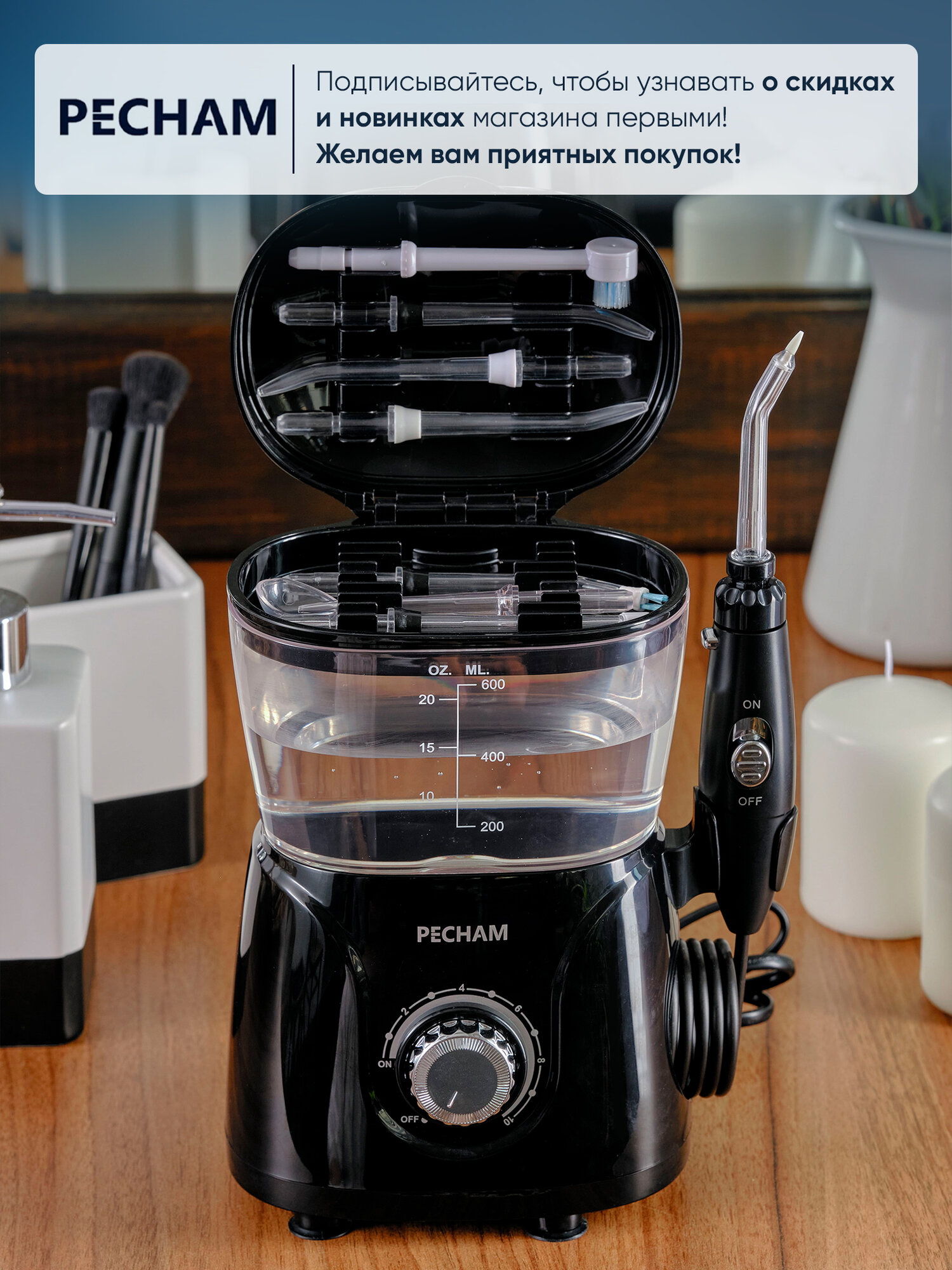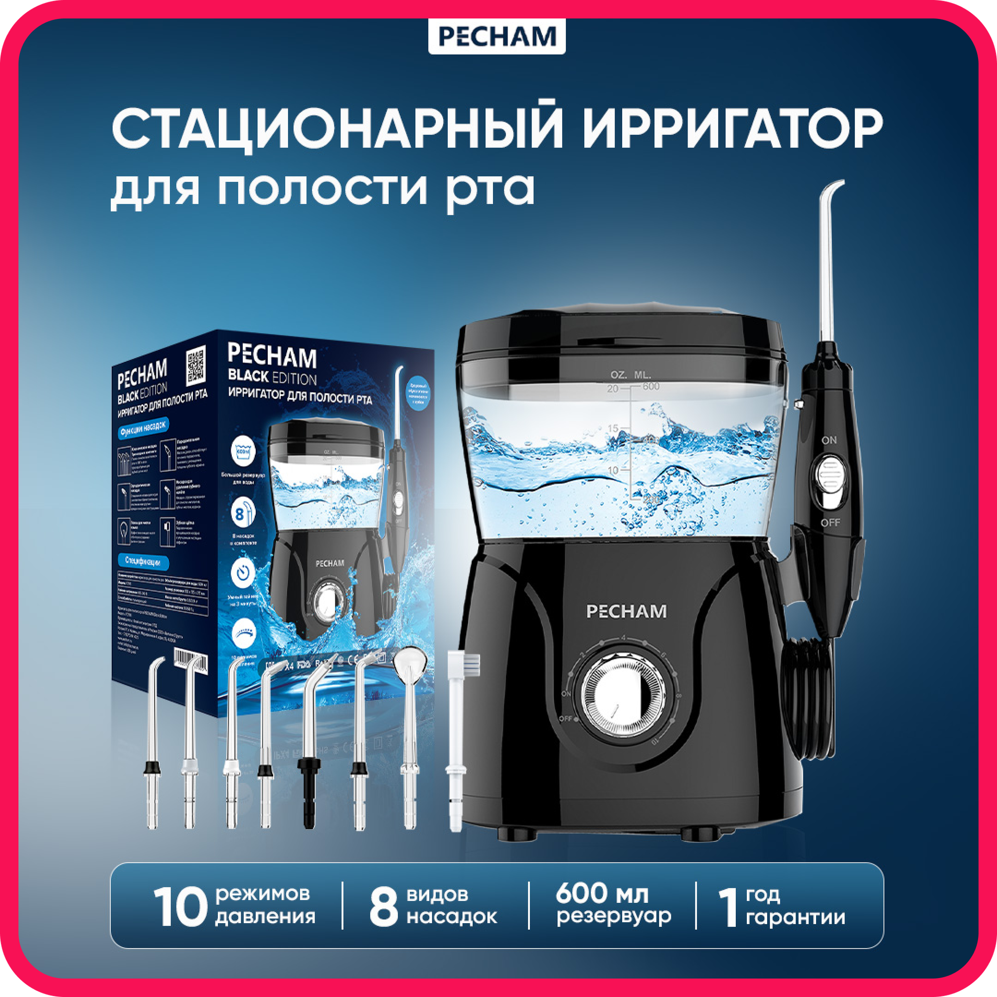 Ирригатор стационарный для полости рта PECHAM Professional Black Edition, 600 мл, 8 насадок, семейный интересное: