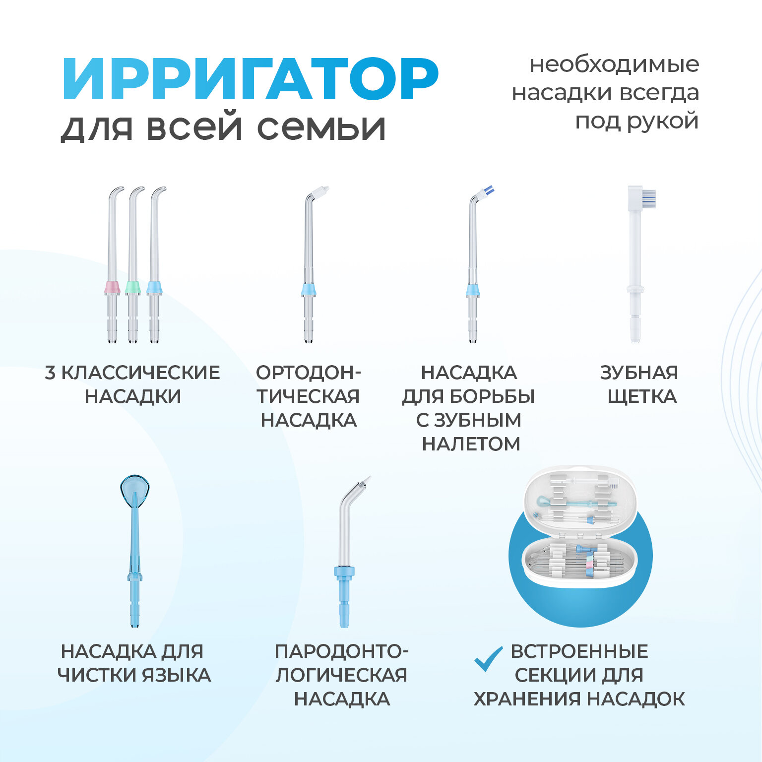 Ирригатор очень компактный, много места не занимает. Много насадок, хорошо чистит и зубы, и дёсны, и язык. Есть ещё насадка для брекетов, но я ею не пользовалась. В общем, вещь очень хорошая, удобная в использовании! Качественно очищает и при этом не так уж и дорого стоит.