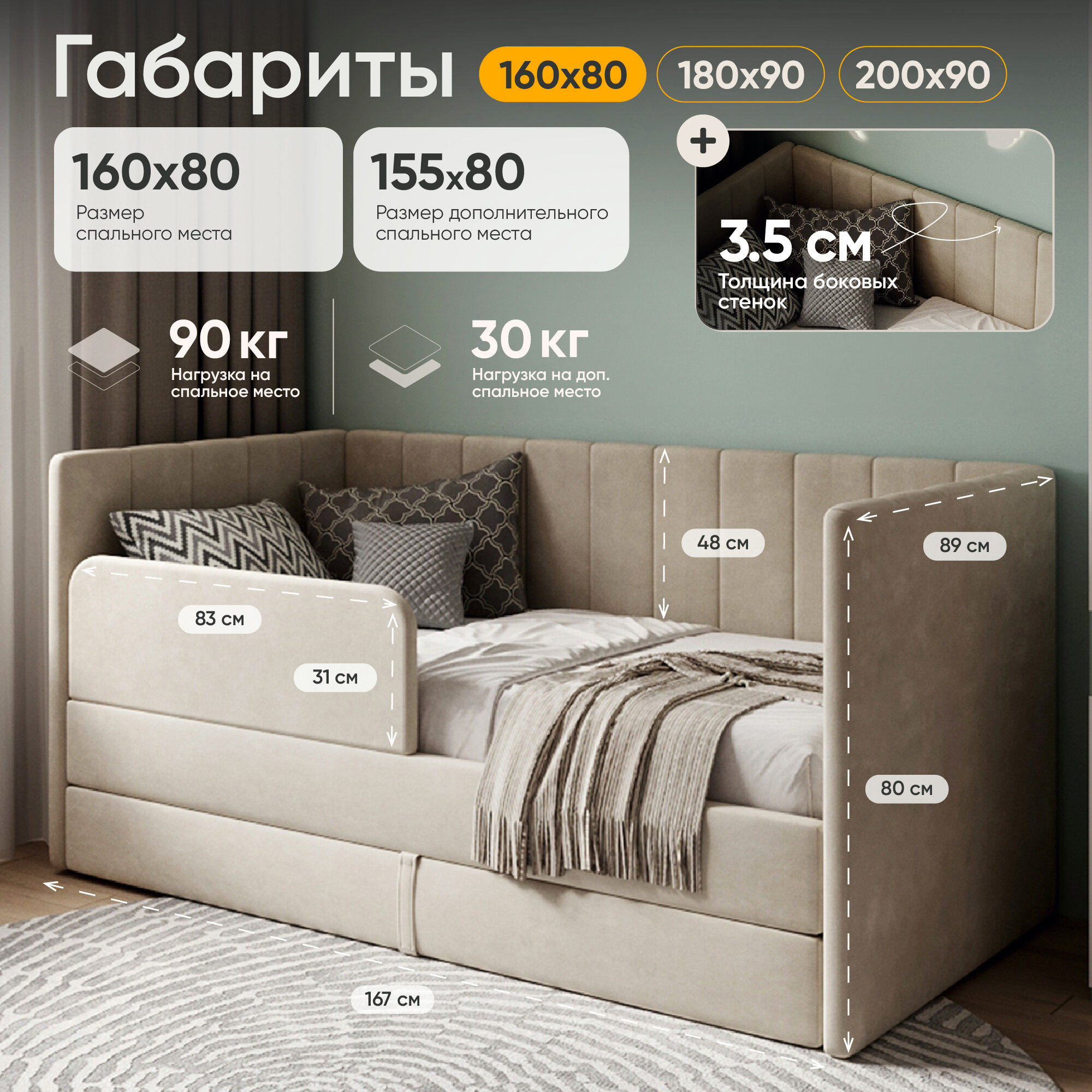 Купить Кровать детская 160х80 см Huggy, цвет Бежевый, диван-кровать выкатной от 3 лет, тахта кровать односпальная подростковая с ящиком и защитными бортиками