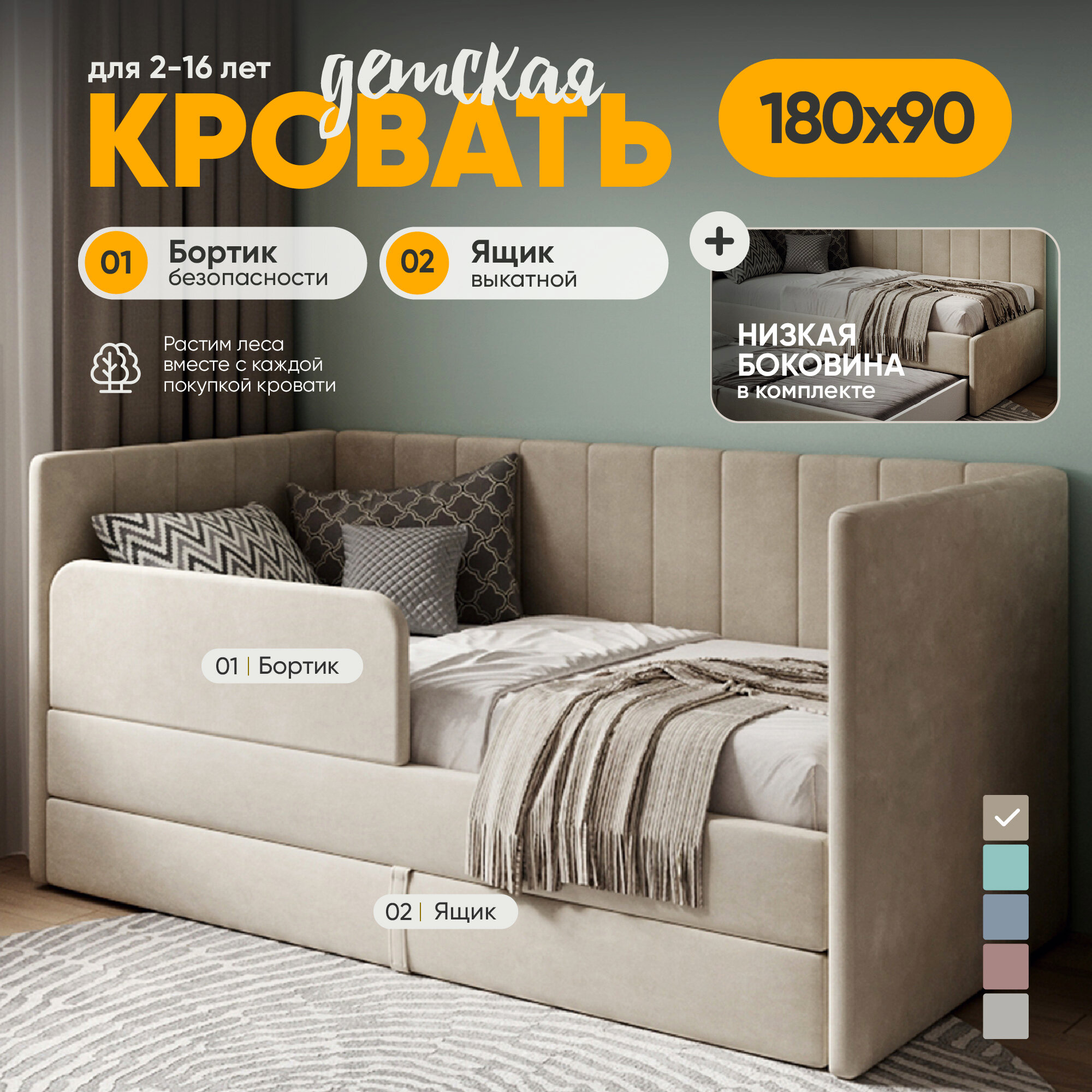 Кровать детская Huggy с защитным бортиком и выкатным ящиком 180х90 см, цвет Бежевый, диван кровать с мягким изголовьем