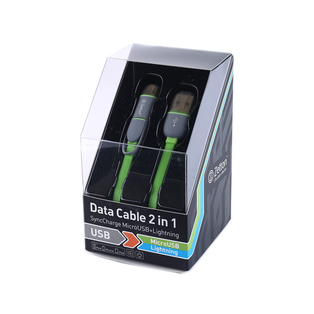 Кабель ZETTON 2 в 1: Lightning - Micro USB, зеленый