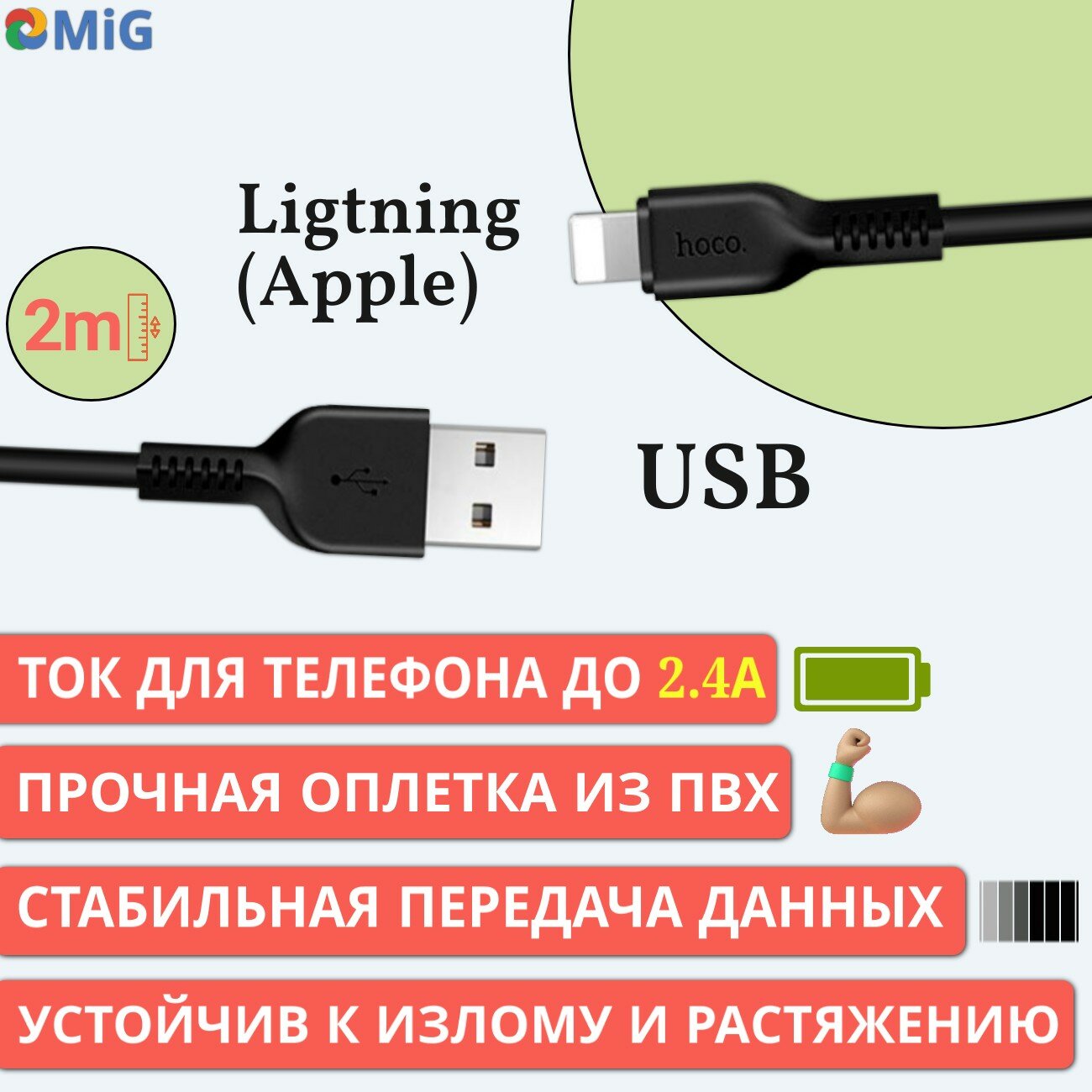 Кабель для iPhone, быстрая зарядка, 1 метр, передача данных / USB провод для iPad airPods / шнур для разъема Lightning / Hoco. X20