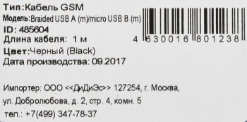 | Разъемы кабеля | USB 2.0 (am) - microUSB (bm) |