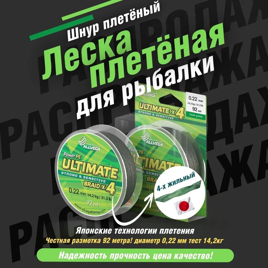 Плетеный шнур Allvega Ultimate 92м, 0.22мм, 14.2кг, тёмно-зелёный