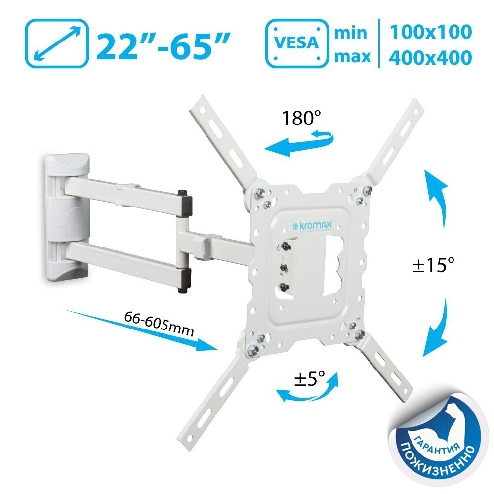 Кронштейн Kromax DIX-18W, для ТВ, наклонно-поворотный, 22-65", до 40 кг, 66-605 мм, белый
