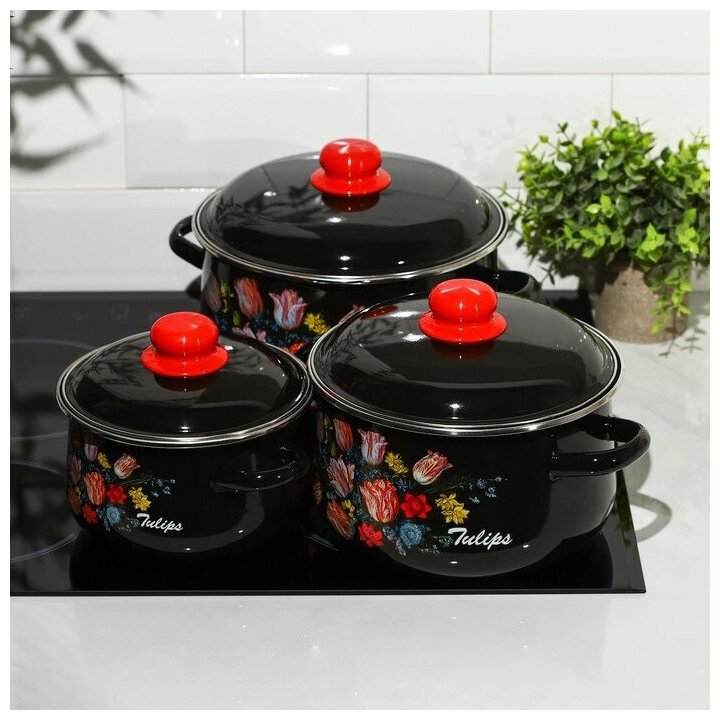 Стальэмаль Набор кастрюль «Букет тюльпанов», 3 предмета: 2 л, 4 л, 5,5 л, цвет чёрный