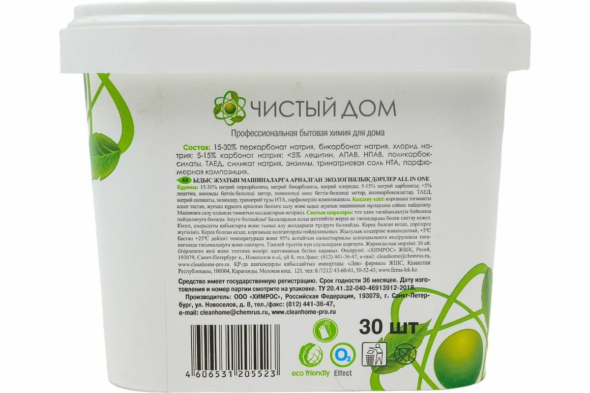 Таблетки для посудомоечных машин Clean home All In One, экологичные, бесфосфатные, 30 шт (4606531205523)