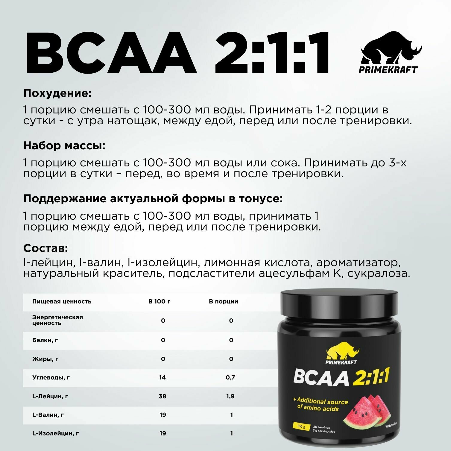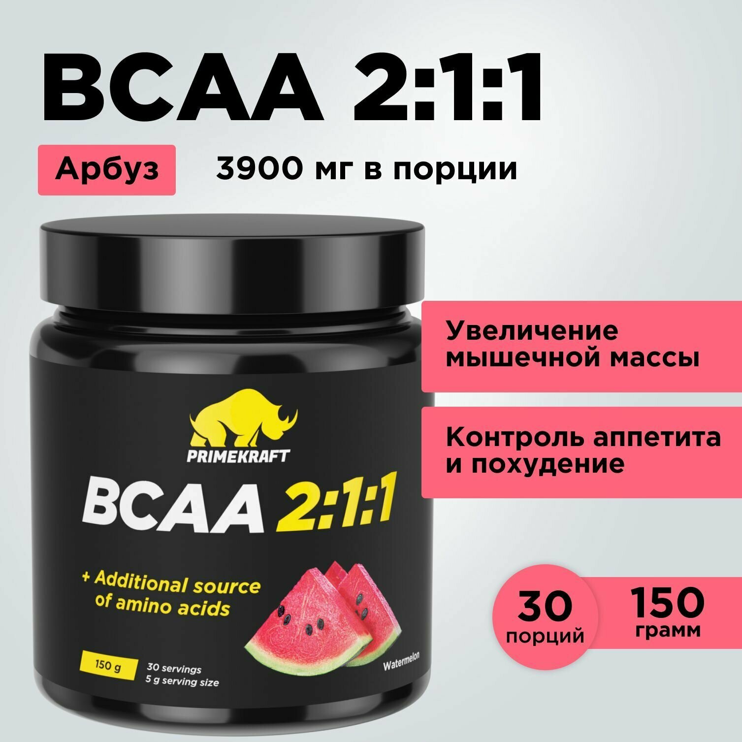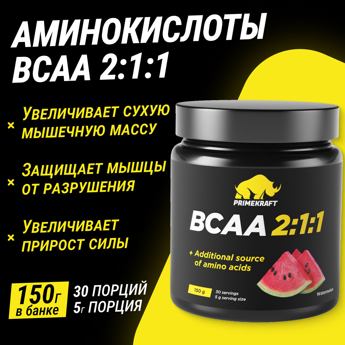 Аминокислоты PRIMEKRAFT BCAA 2:1:1 (БЦАА) со вкусом Арбуз, 150 г