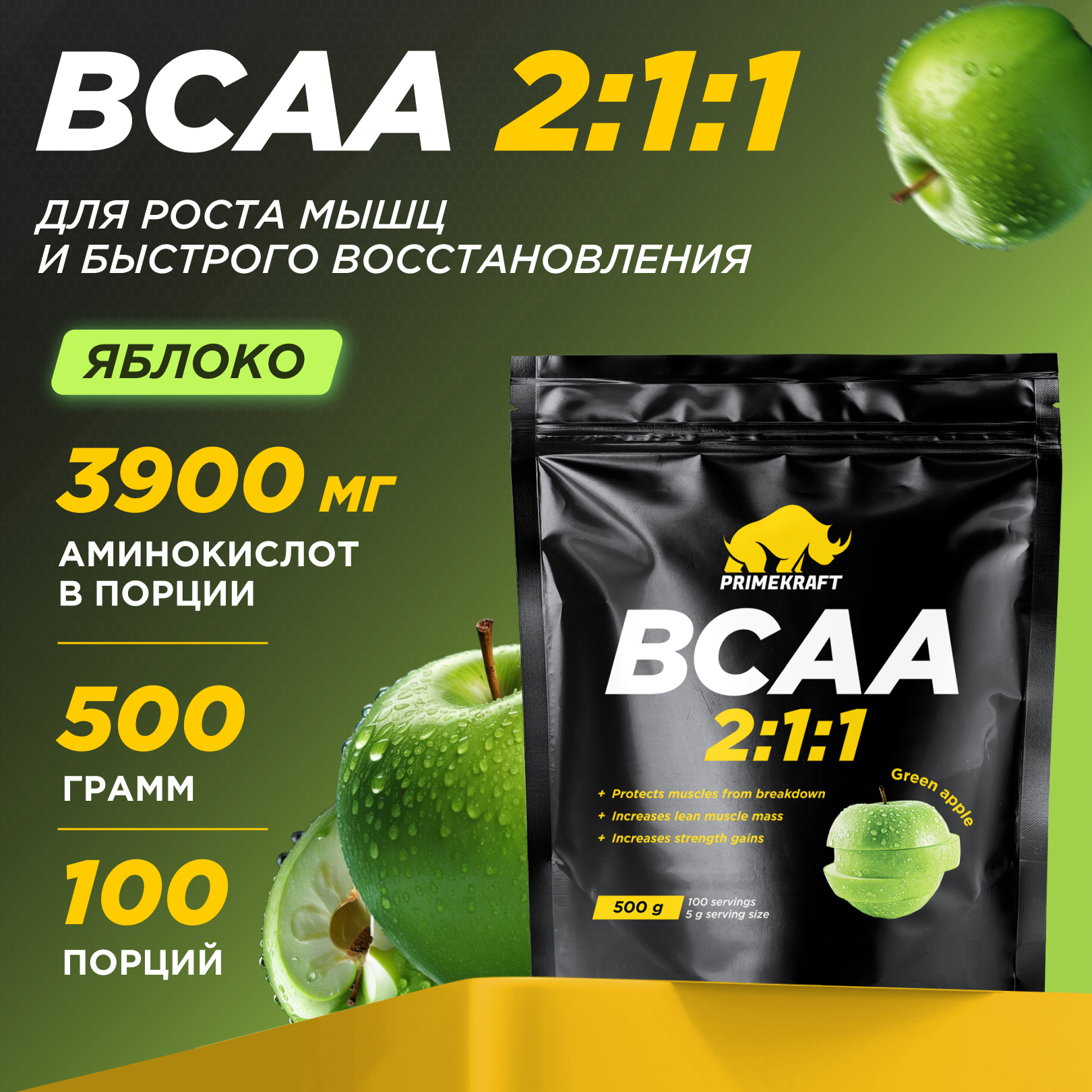 Prime Kraft BCAA 2:1:1 дойпак (500 гр.)_ Зелёное яблоко