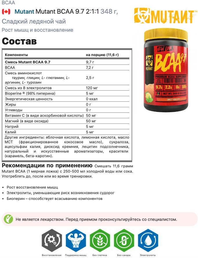 Ниже Вы можете прочитать отзывы на Бсаа Mutant BCAA 9.7 2:1:1 348 г, Сладкий ледяной чай, ознакомится с подробными характеристиками, посмотреть интересные обзоры и фотографии на Бсаа Mutant BCAA 9.7 2:1:1 348 г, Сладкий ледяной чай.