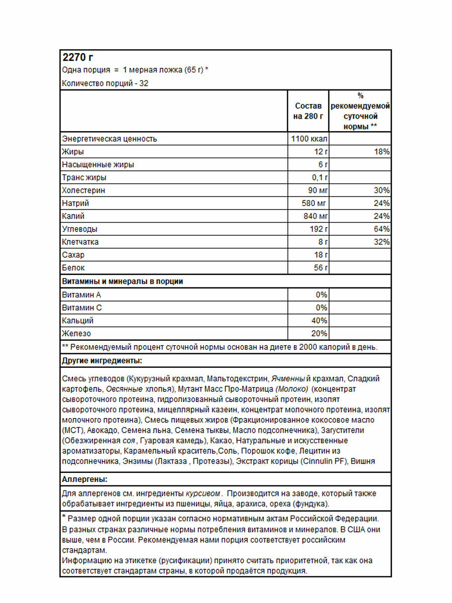 | Плюсы: | Разные источники белка и углеводов, сложный состав, не набирается жир от него. |