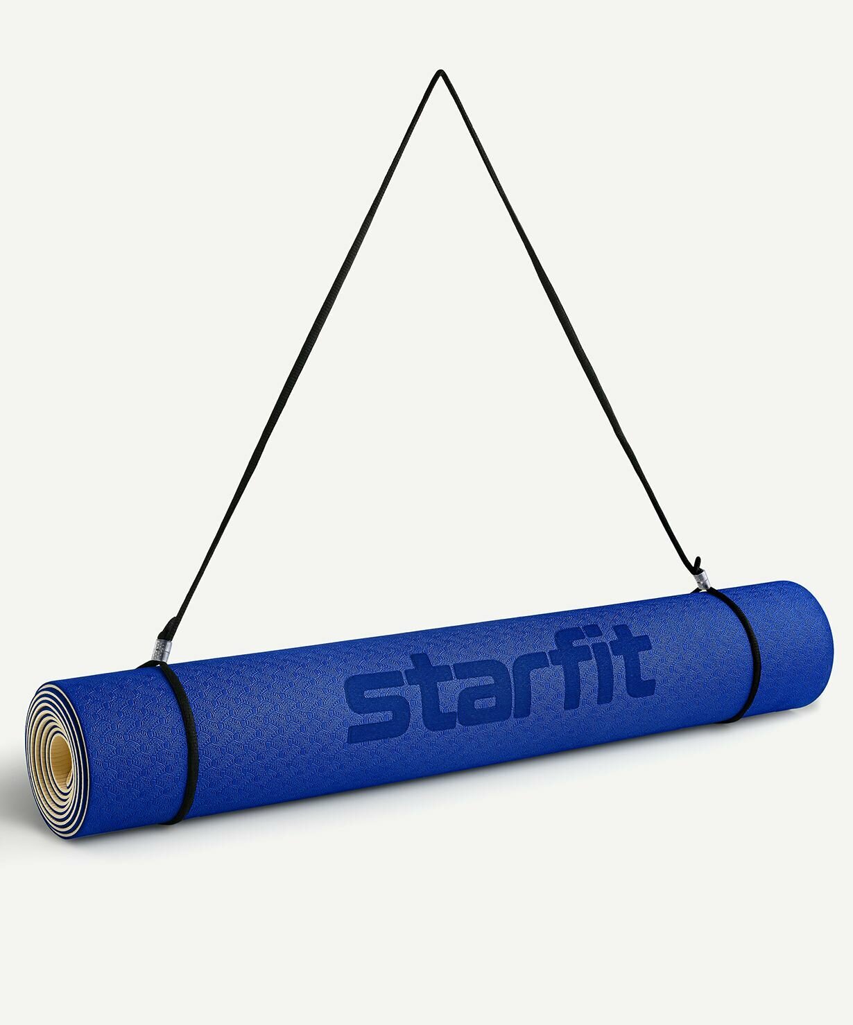Коврик для йоги и фитнеса STARFIT FM-201, TPE, 183x61x0,4 см, синий/бежевый с шнурком для переноски