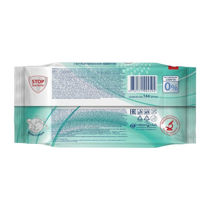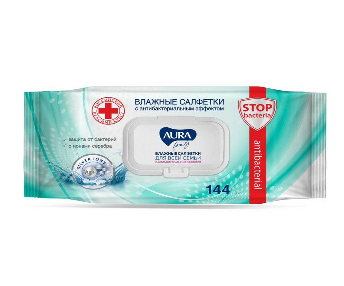 Aura Влажные салфетки Family антибактериальные с ионами серебра, 144 шт.