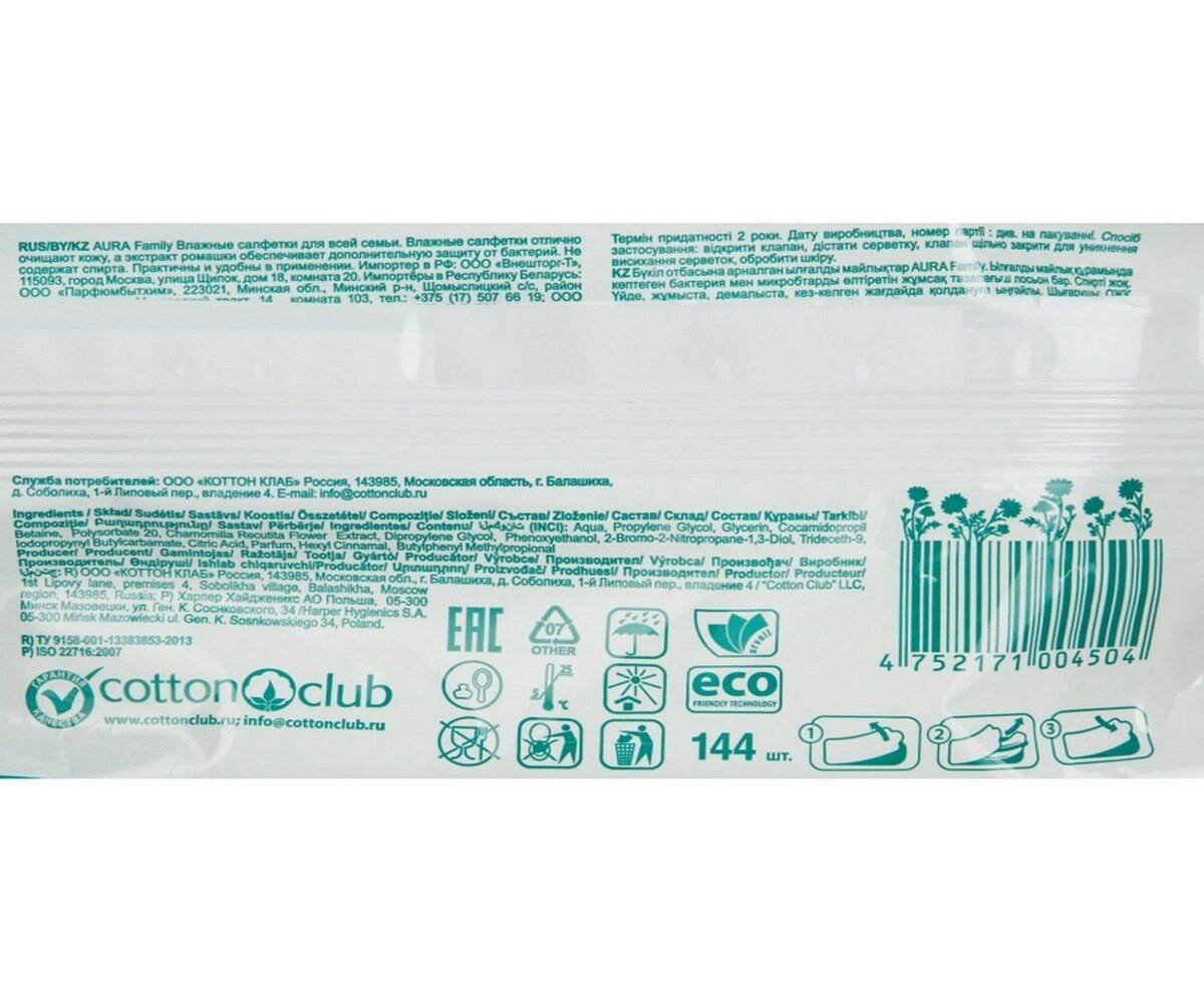 Влажные салфетки 72шт/уп, с антибактериальным эффектом AURA Family 26065 (Коттон Клаб) арт.7044(АН6!