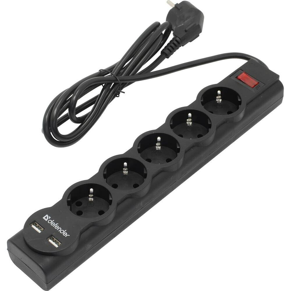 Сетевой фильтр - удлинитель Defender 5 розеток с заземлением , 5 метров , 2 USB ( 2.1 А ) , выключатель , чёрный