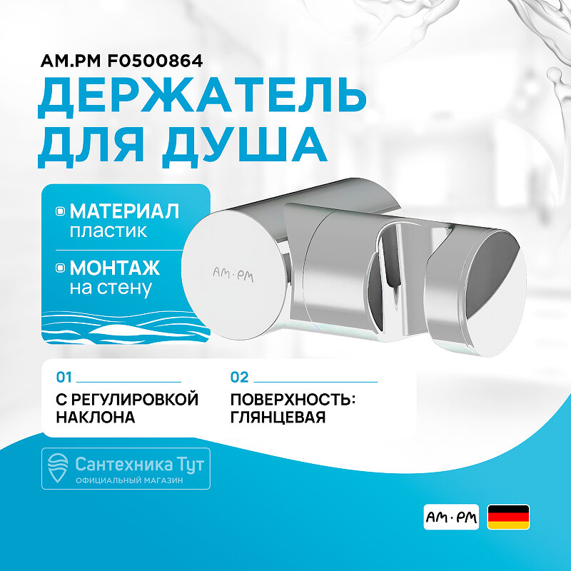 Держатель для душа лейки AM.PM F0500864 хром, на стену, надёжная фиксация душевой лейки, регулировка угла наклона, Германия