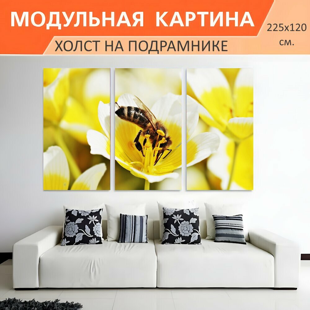 Купить Модульная картина на холсте "Яичница цветок, яичница растение, пчела" триптих на подрамнике 225х120 см. для интерьера