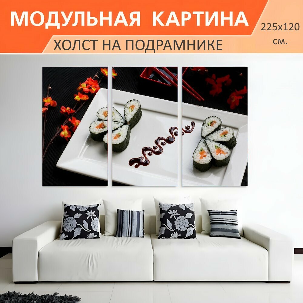 Модульная картина на холсте "Суши, японская еда, японский" триптих на подрамнике 225х120 см. для интерьера интересное: