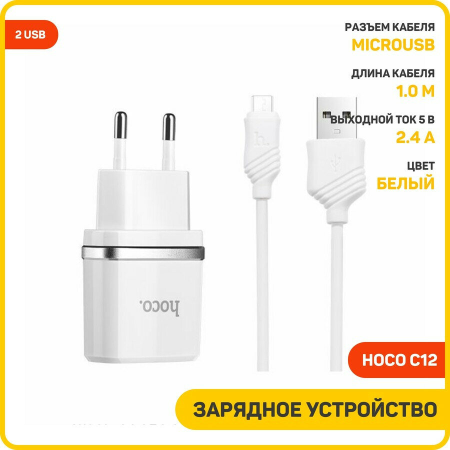 Сетевое зарядное устройство (СЗУ) Hoco C12A (2 USB) + кабель MicroUSB, 2.4 А, белый