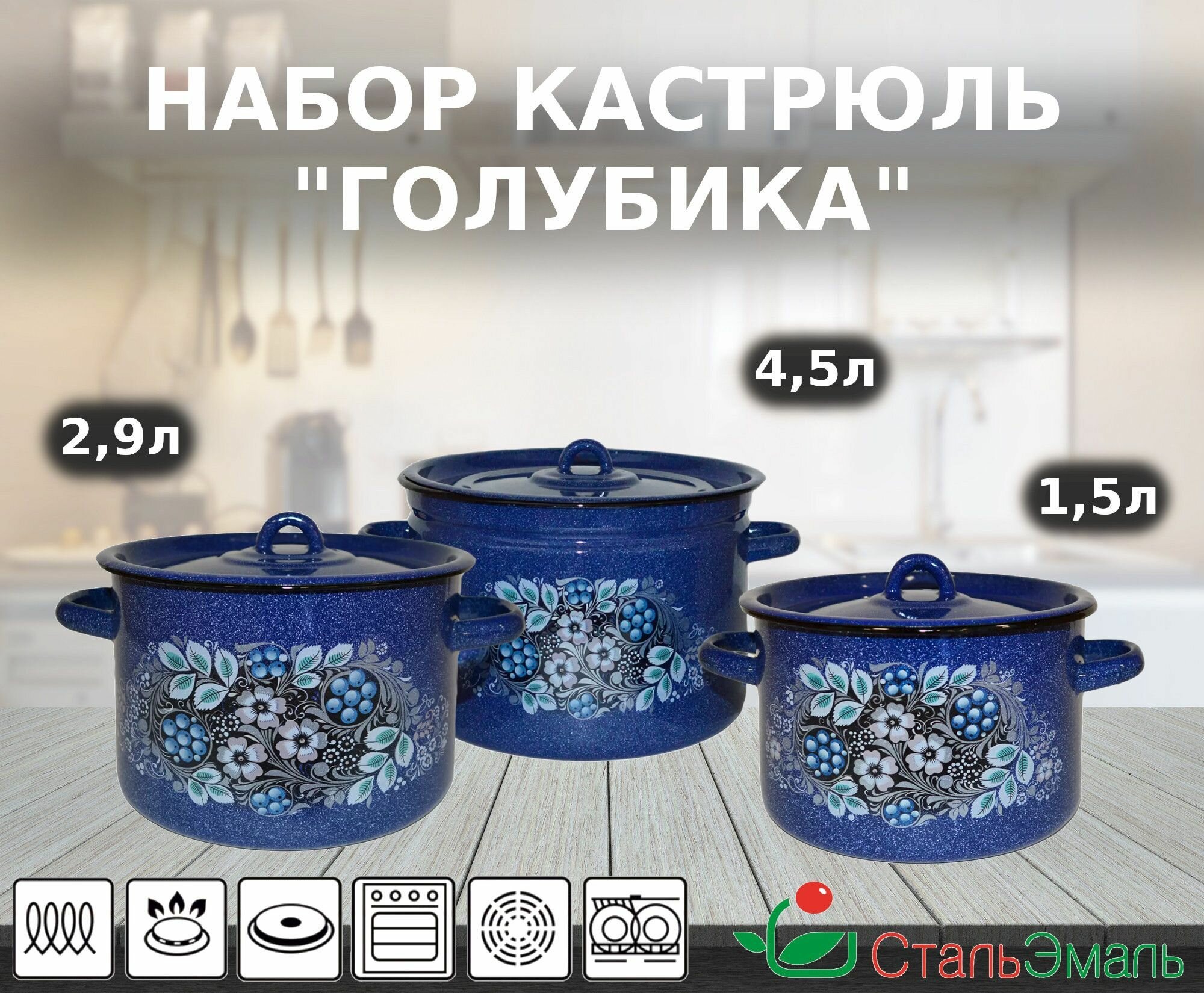 Стальэмаль Набор кастрюль «Голубика», 3 предмета: 1,5 л, 2,9 л, 4,5 л, индукция, цвет синий