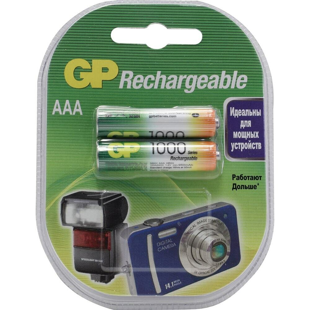 Батарейки аккумуляторные комплект 2 шт., GP, AAA (HR03), Ni-Mh, 1000 mAh, блистер, 100AAAHC-2DECRC2, 100AAAHC2DECRC2 (арт. 454112)