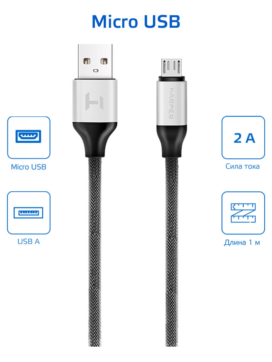 Кабель USB - microUSB, HARPER, BRCH-310, 1 м, серебряный H00001359, 1 шт.