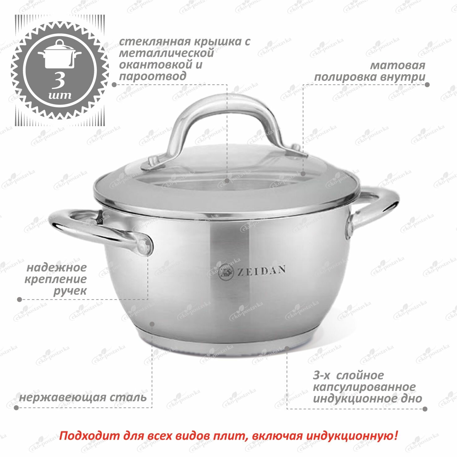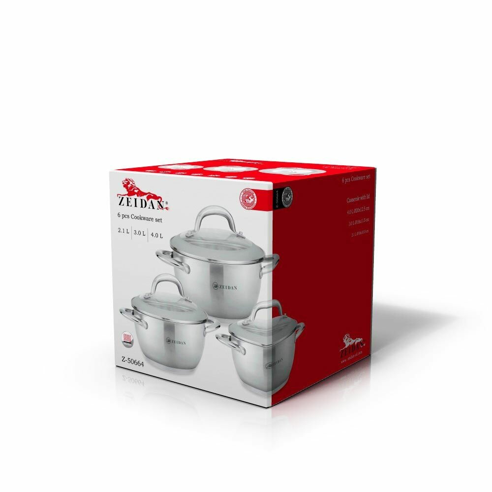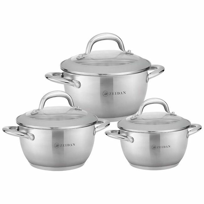 Набор посуды для приготовления из нержавеющей стали Zeidan кастрюли 2.1, 3 и 4 литра с крышками для газовых, электрических и индукционных плит