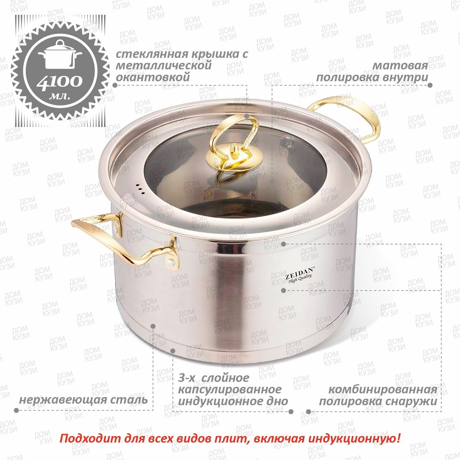 Набор посуды для приготовления из нержавеющей стали Zeidan кастрюли с крышками для газовых электрических и индукционных плит 2,1, 3 и 4 литра