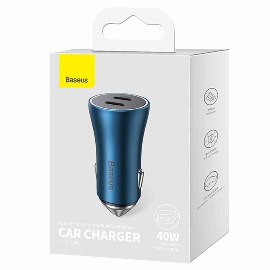 Купить Автомобильное зарядное устройство BASEUS Golden Contactor Max Dual Fast Charger, 2xUSB-C, 5A, 40W, синий