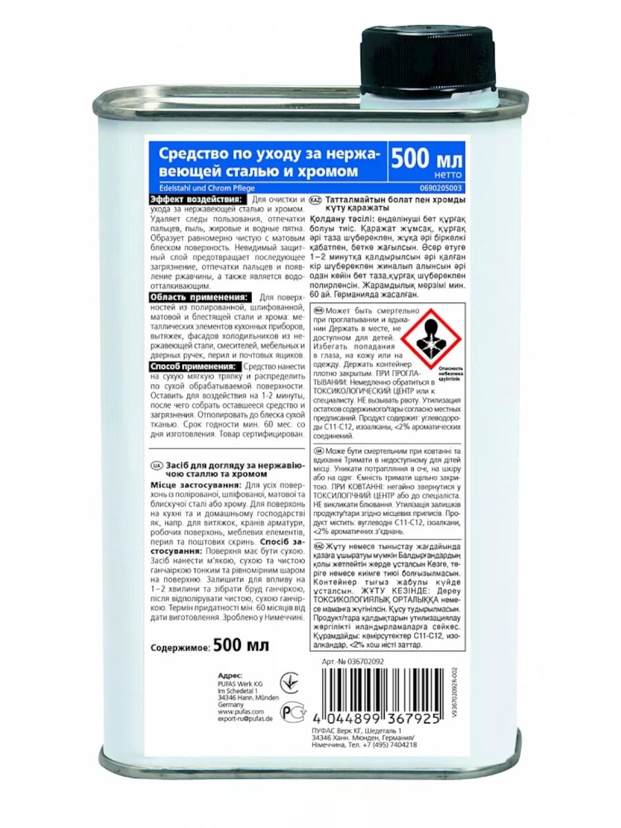 Glutoclean PUFAS Пуфас Средство по уходу за нержавеющей сталью и хромом 500 мл 036702092 интересное: