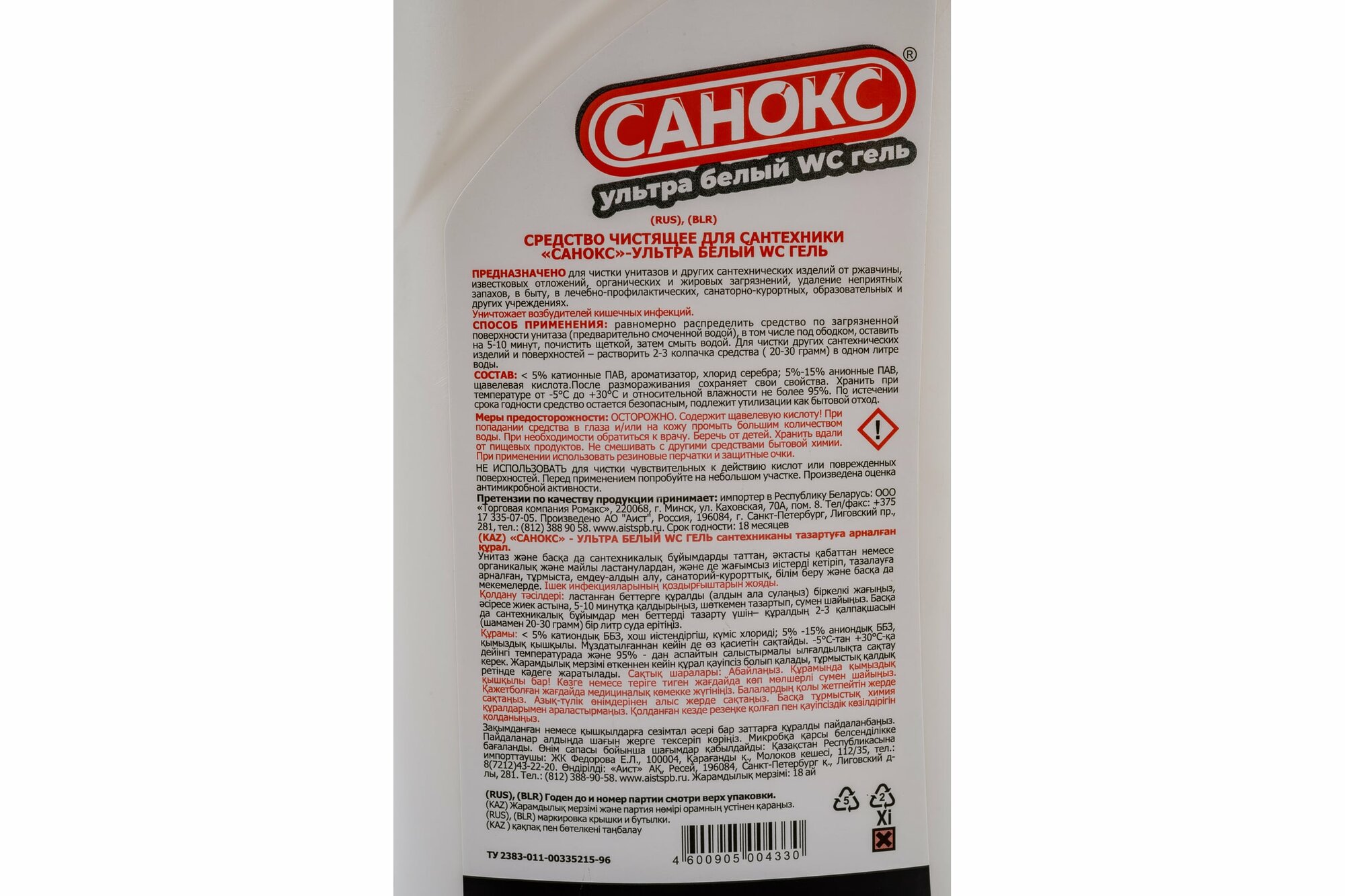 Средство для санузлов санокс 1100мл-ультра Белый WC гель для чистки унитазов и других сантехнических изделий