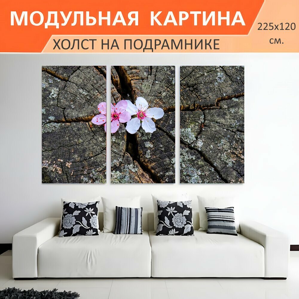 Купить Модульная картина на холсте "Древесина, вишня в цвету, весна" триптих на подрамнике 225х120 см. для интерьера