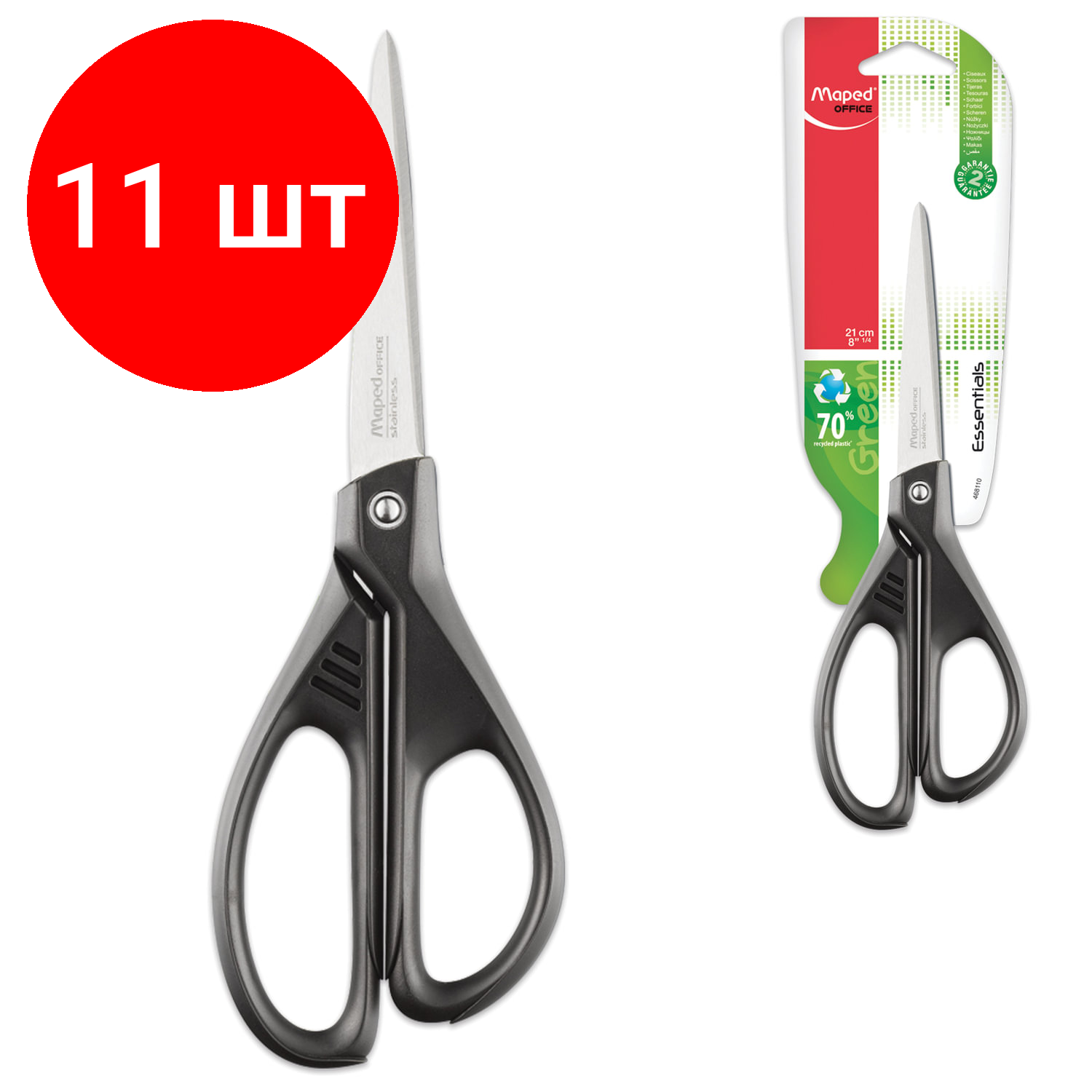 Купить Комплект 11 шт, Ножницы MAPED"Essentials Green", 210 мм, черные, эргономичные ручки, картонная упаковка с европодвесом, 468110