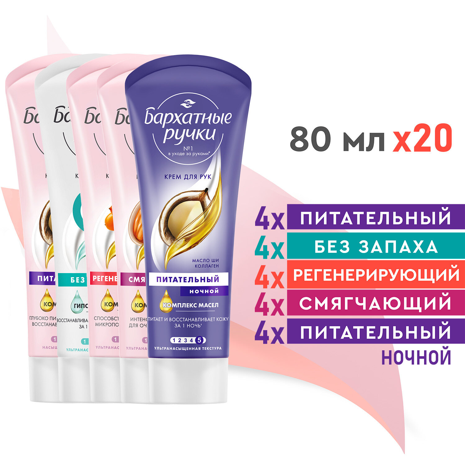 Крем для рук Бархатные ручки Ночной Восстанавливающий + без запаха + Регенерирующий + Питательный + Смягчающий 80 мл (20 шт)