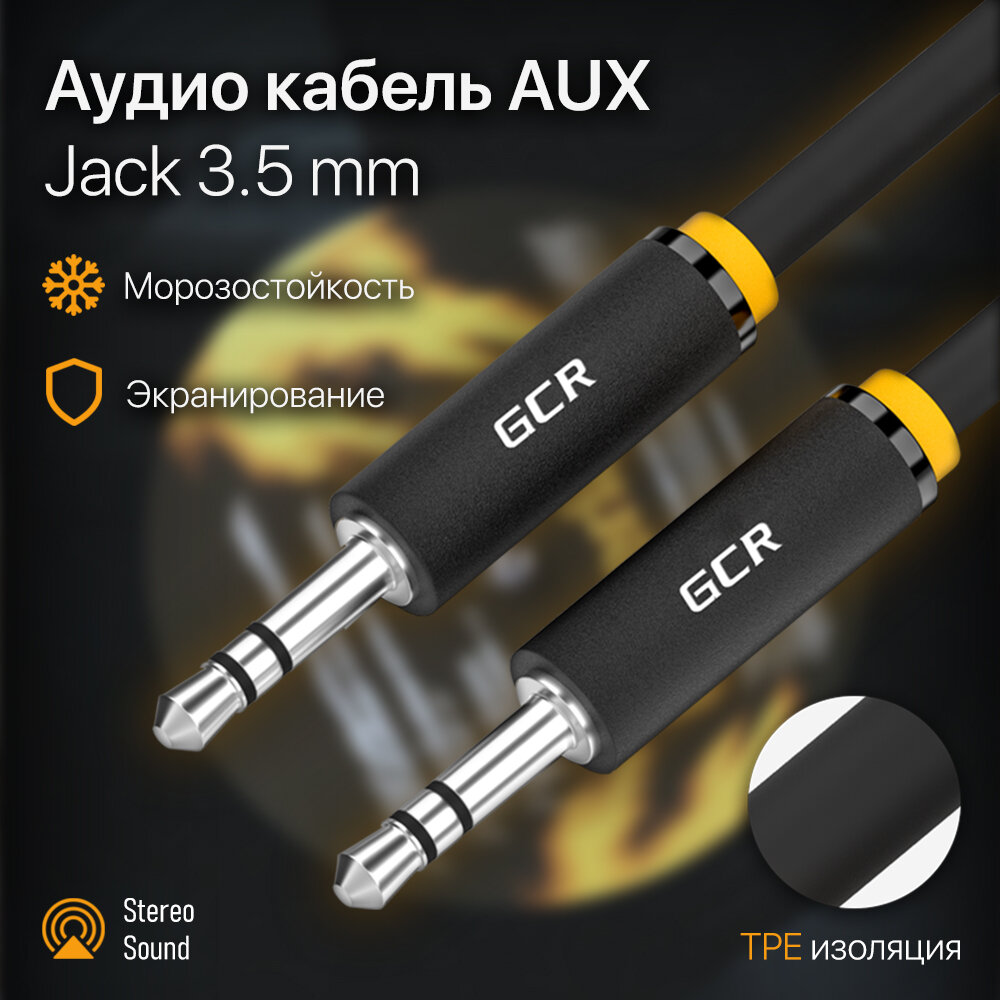 GCR AUX кабель 1м аудио jack 3,5mm/jack 3,5mm черный, желтая окантовка, ультрагибкий, экран, стерео