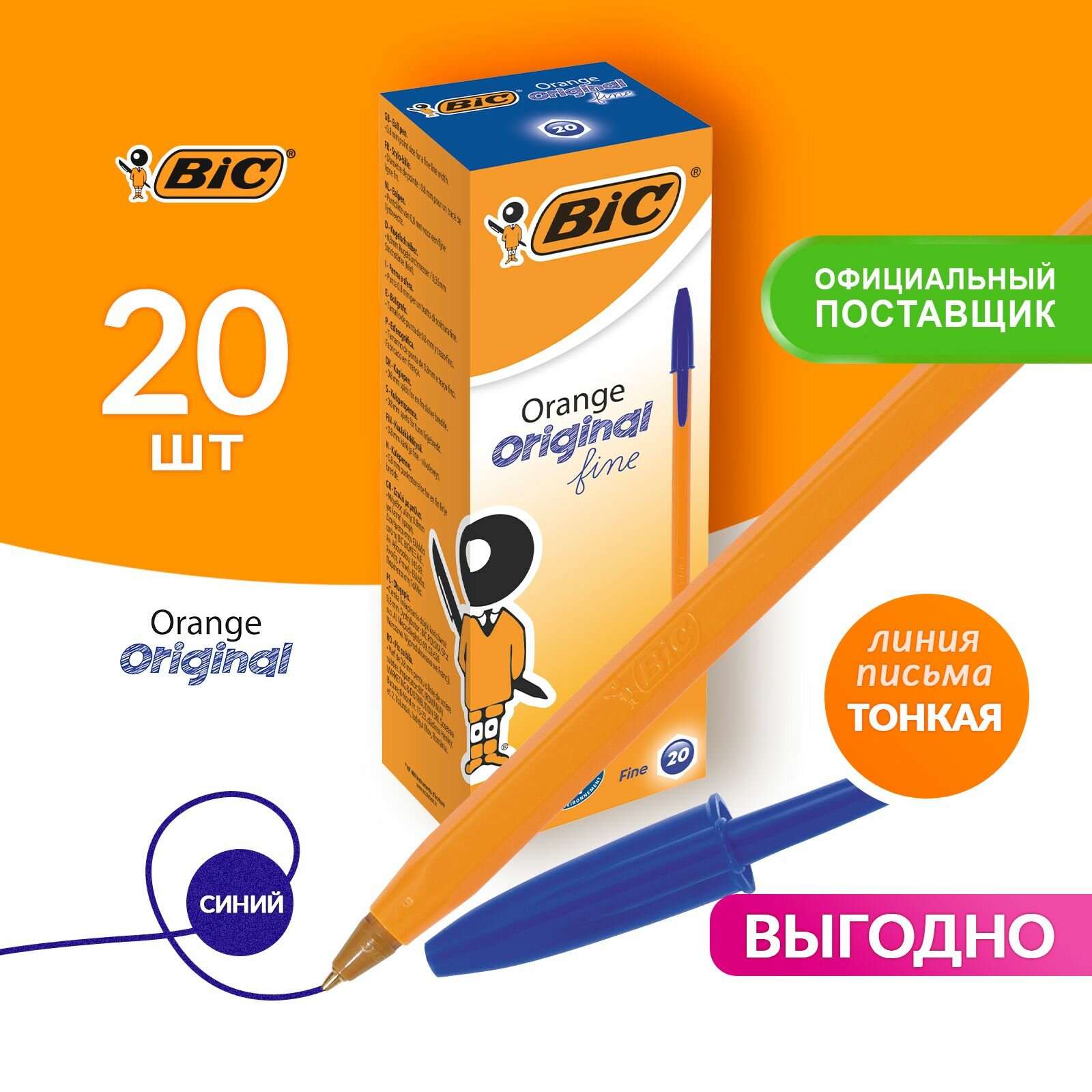 Ручки шариковые набор / комплект Bic Orange, 20 штук, Синяя, корпус оранжевый, 0,8мм, линия 0,3мм, 880485