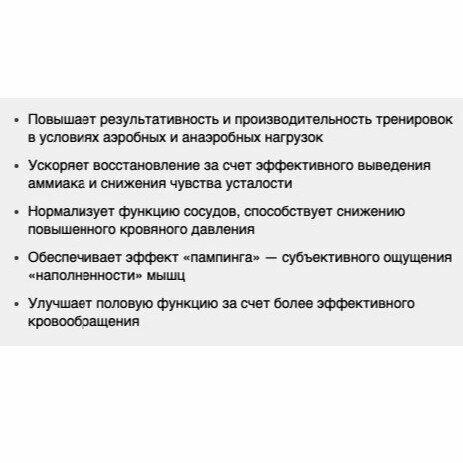 | Плюсы: | усваивается лучше аргинина |