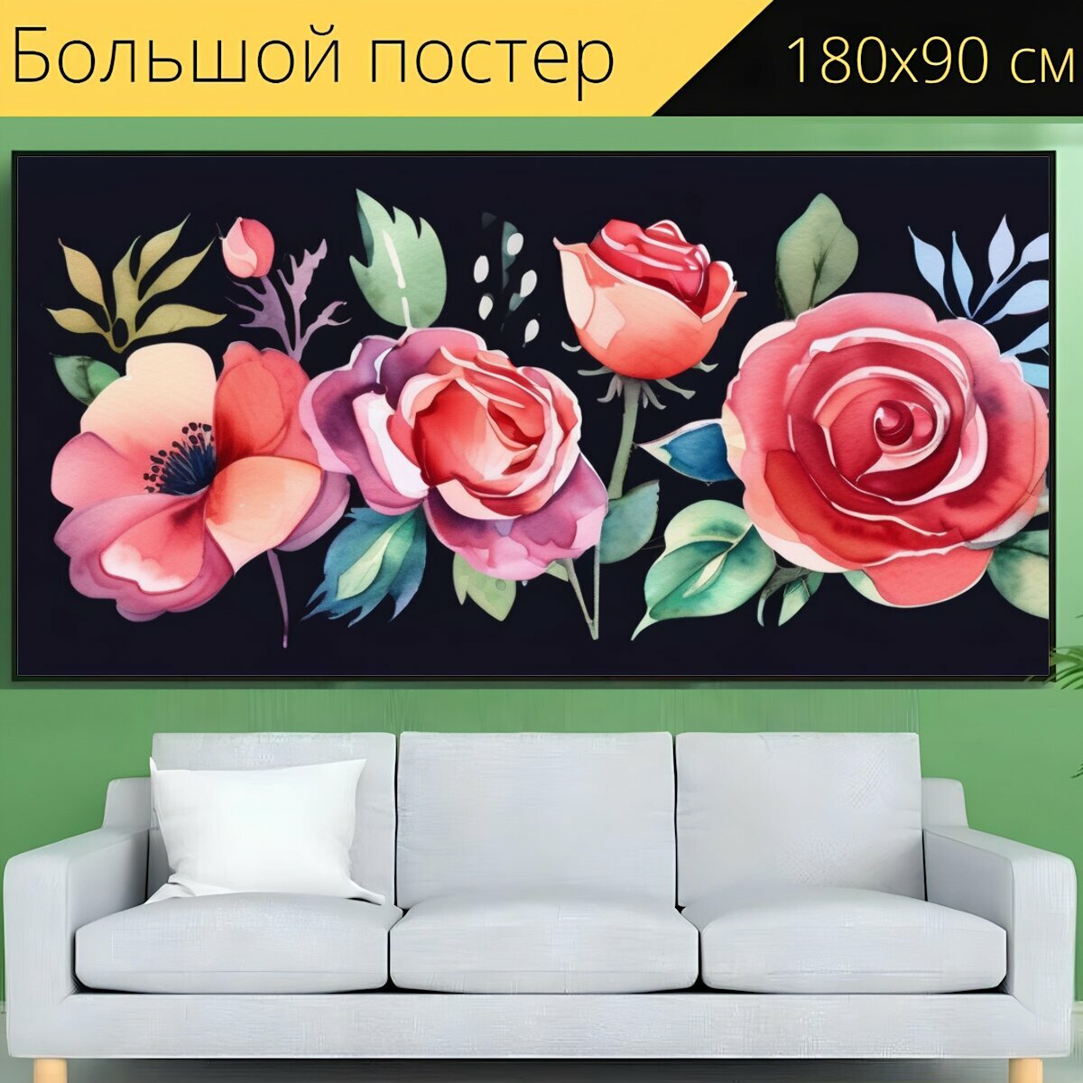 Большой постер "Цветы розы, в стиле акварель" 180 x 90 см. для интерьера на стену интересное: